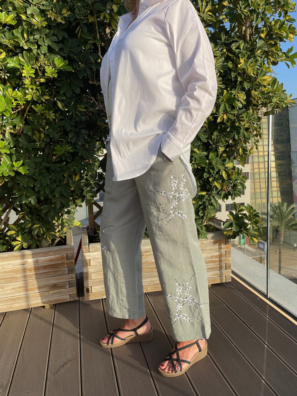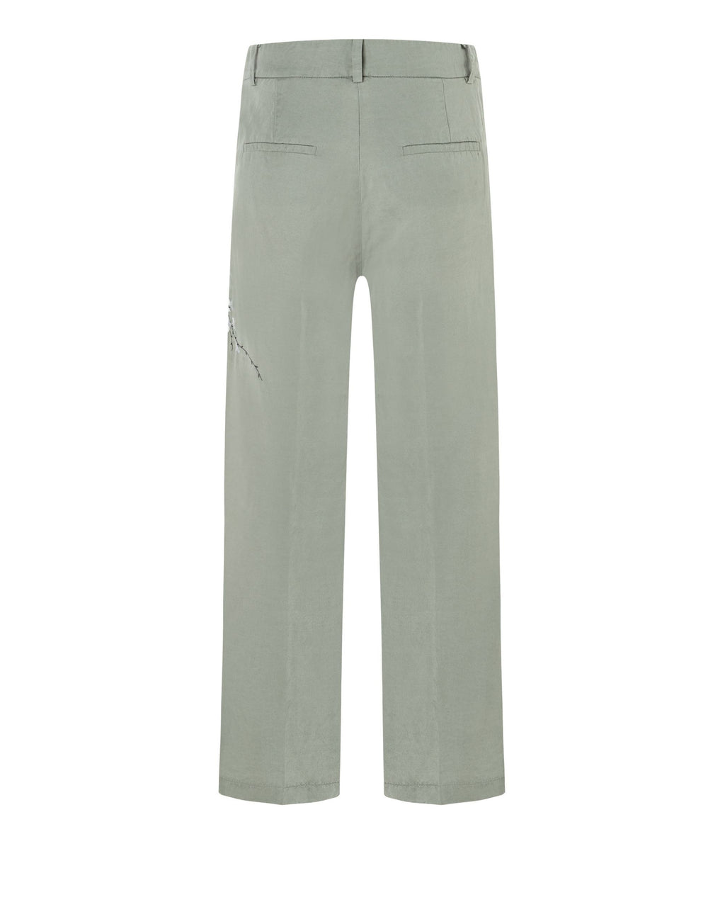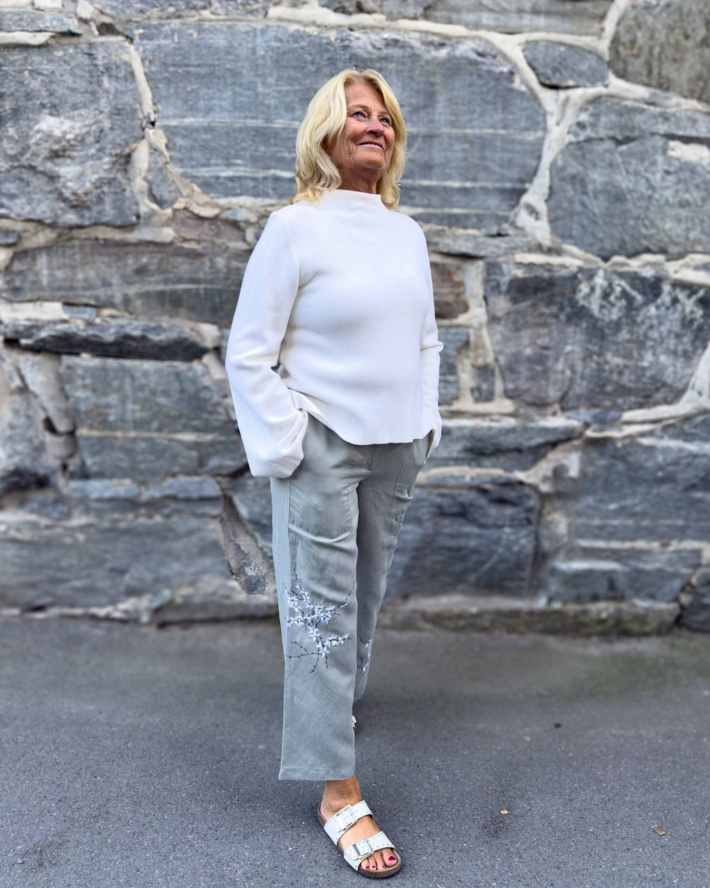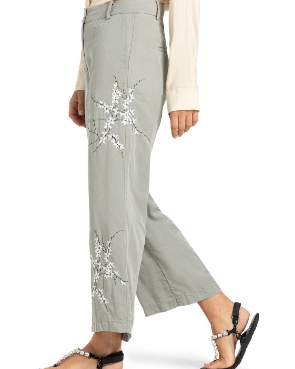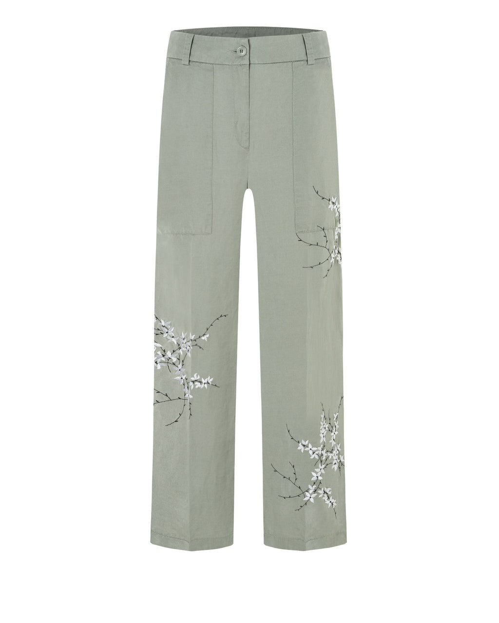 En elegant bukse fra Cambio som kombinerer stil og komfort på en nydelig måte. Høyt liv med beltehemper. Vide og utsvingene ben skaper en raffinert look som passer perfekt til både formelle og uformelle anledninger. Skrå sidelommer og passepoilerte lommer bak. Nydelig bukse med brodert utsmykning. Rekker til ankelen.