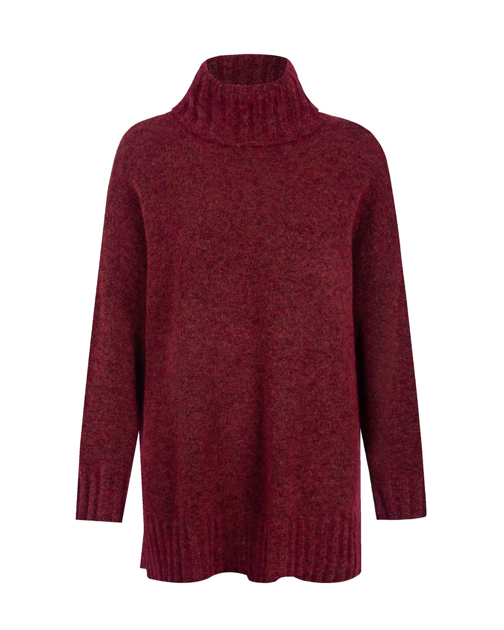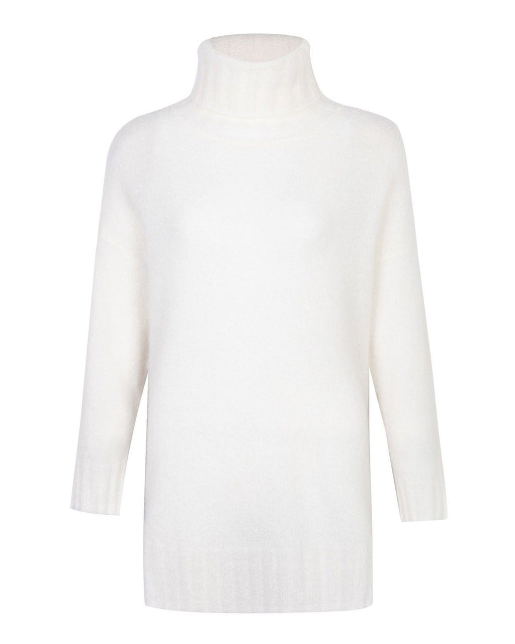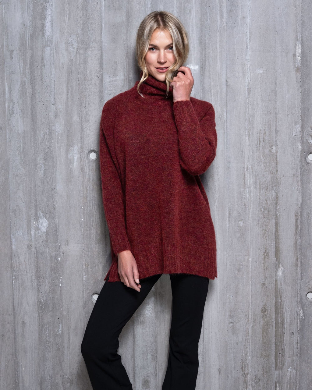 Cindy er en varm og myk genser i kid mohair med høy hals og splitter i sidene. Den har en avslappet, oversized fasong og brede ribbdetaljer på ermer, hals og nederkant. En komfortabel og stilsikker favoritt til kjølige dager.