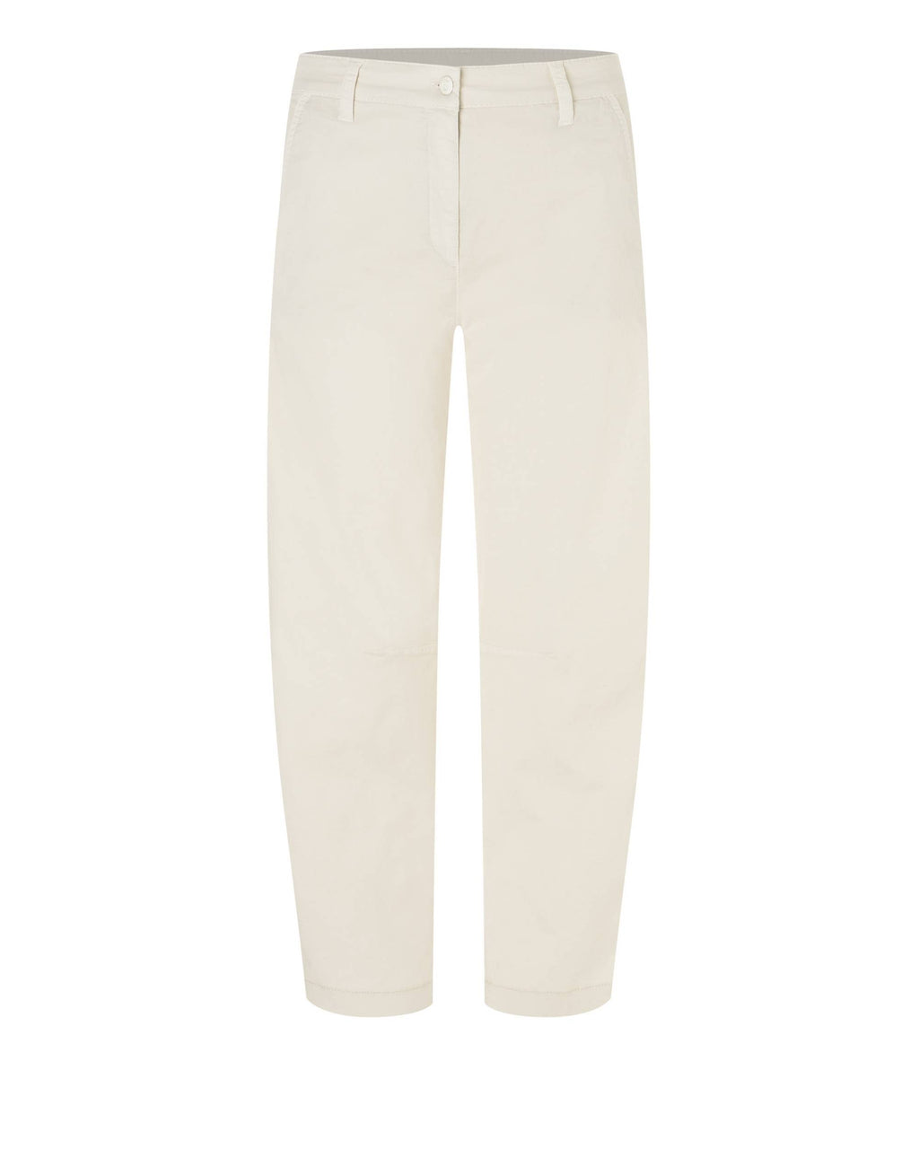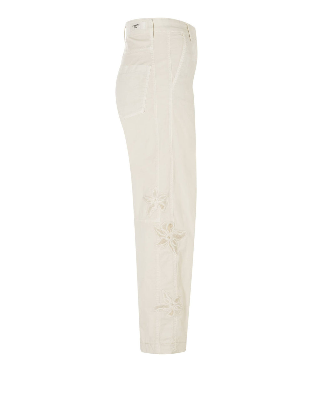 Jeans med vidde i bena som svinger litt innover, fra Cambio. Tøff eggehvit jeans med skrå lommer og høyt liv. Legg merke til de nydelige broderte blomstene på siden.