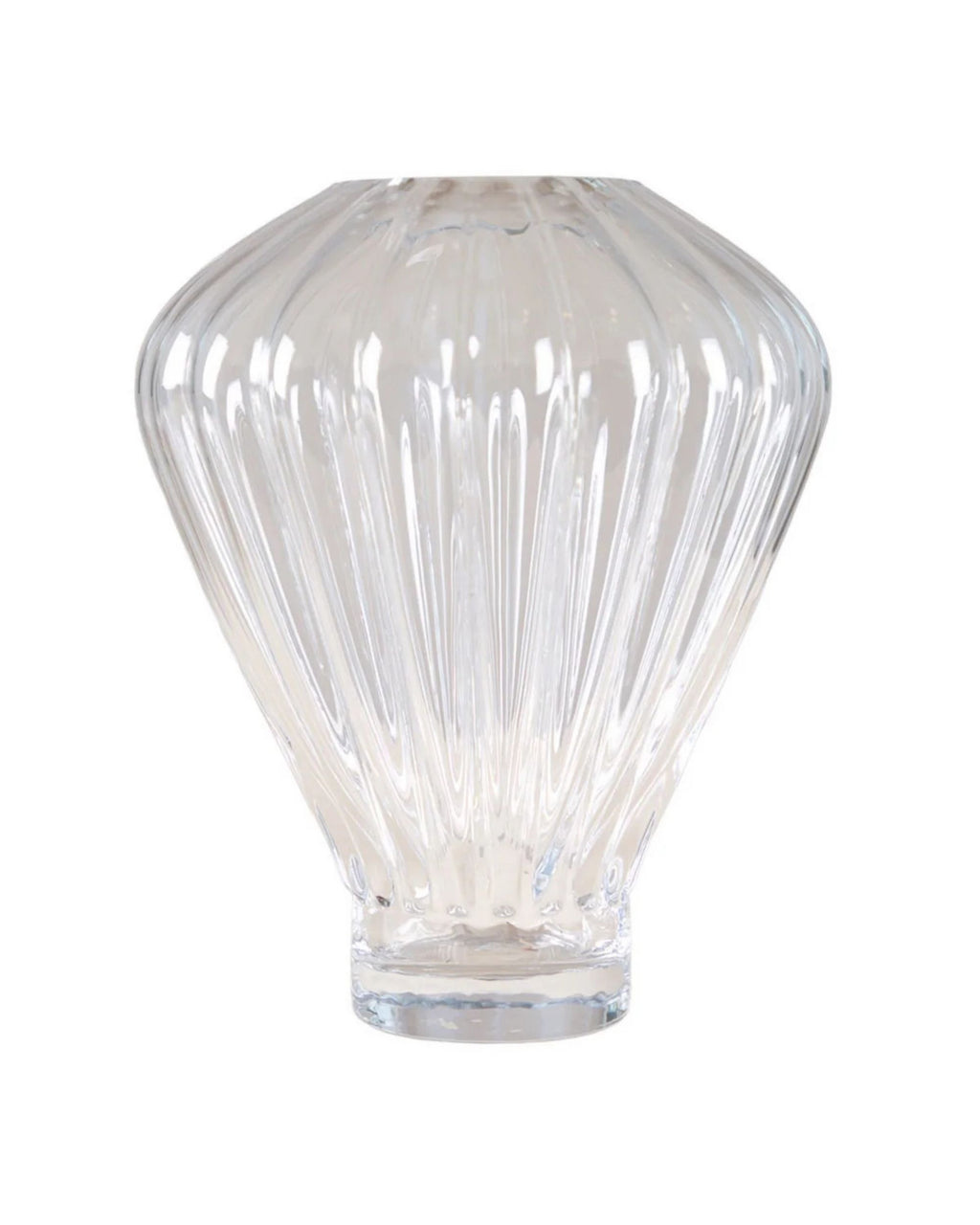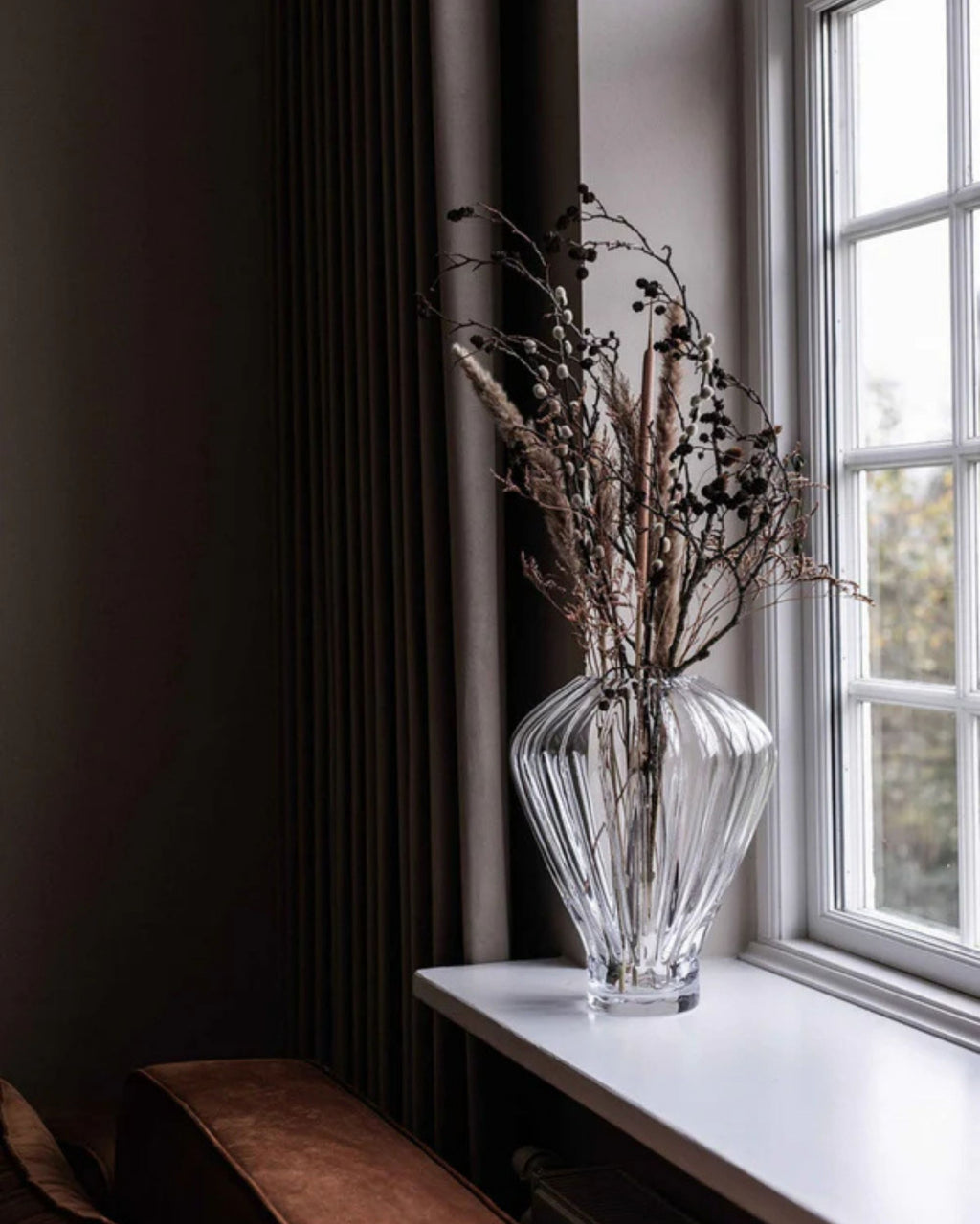 Med sine myke linjer, karakteristiske rifler og generøse form er Evelyn-vasen perfekt både til store buketter og som et dekorativt element i seg selv.