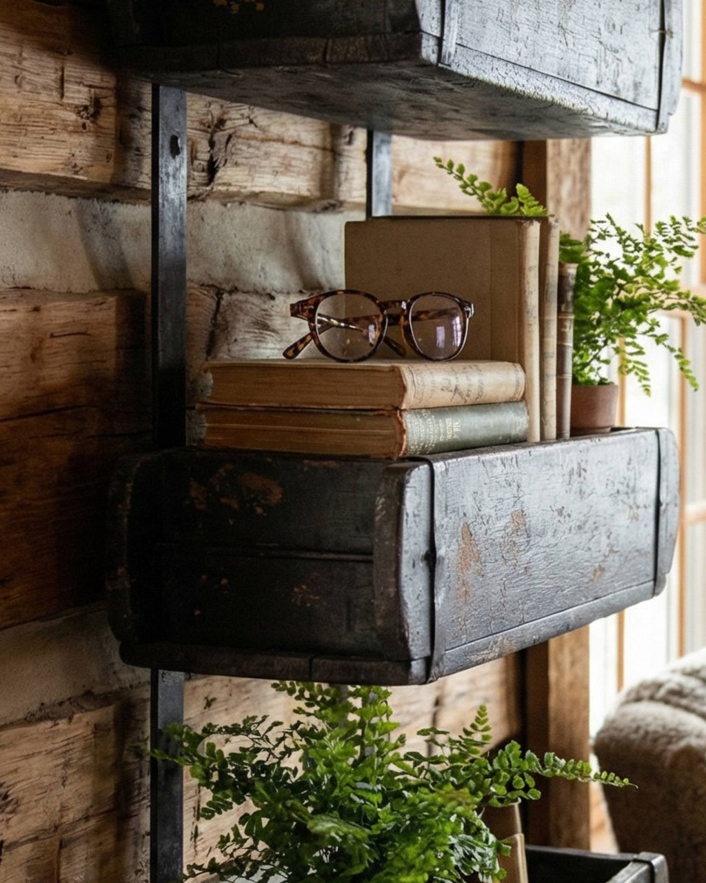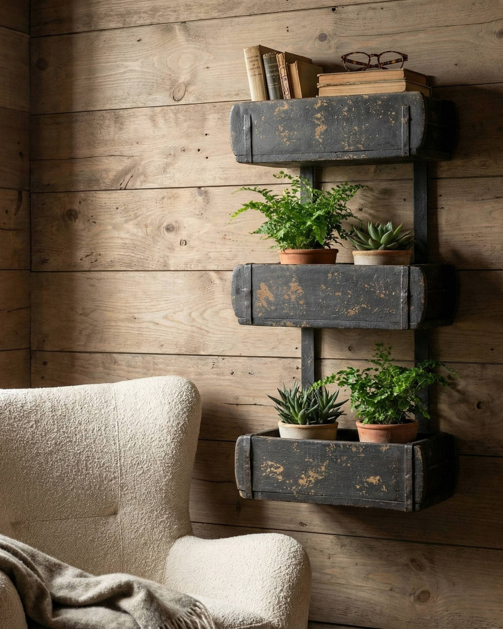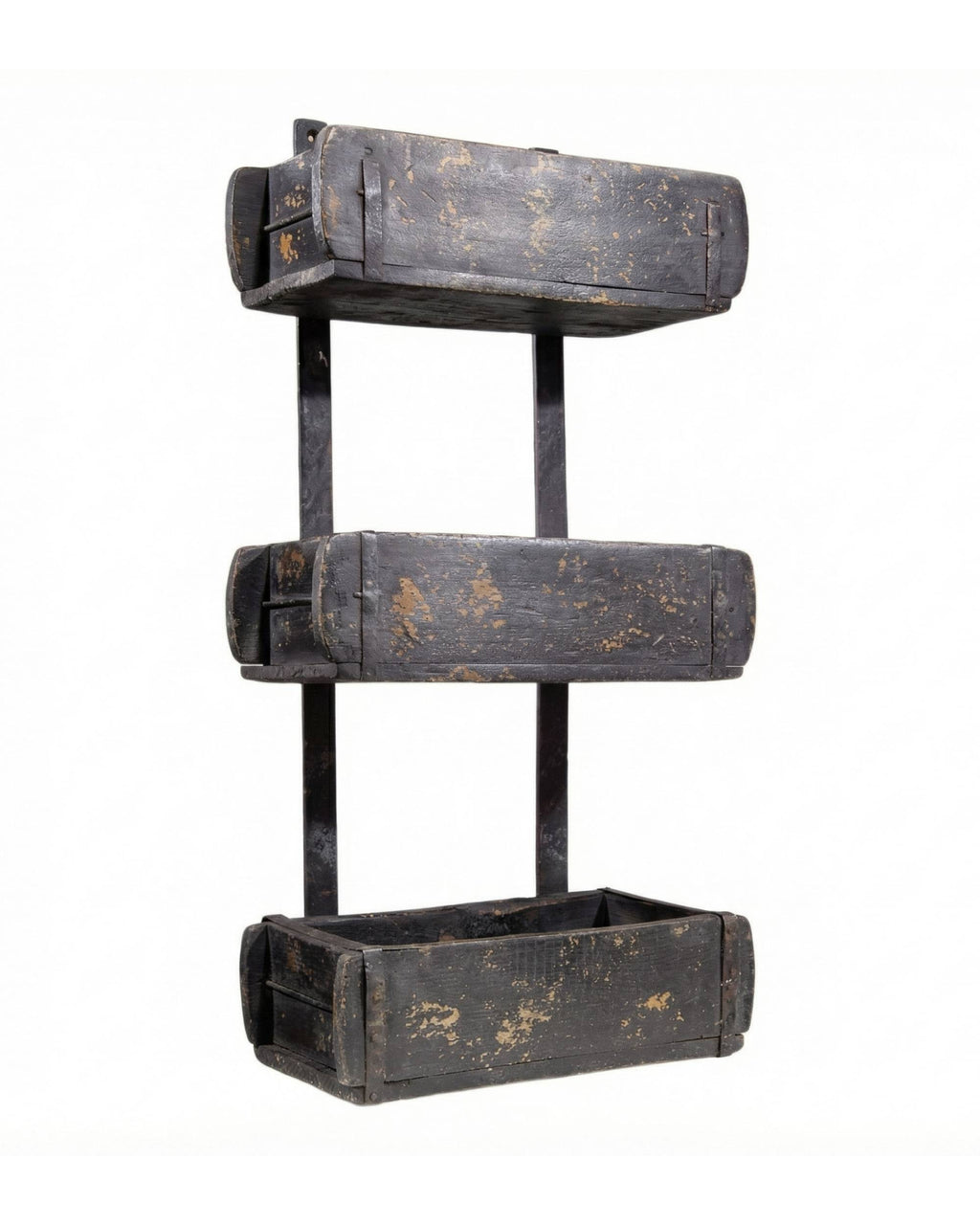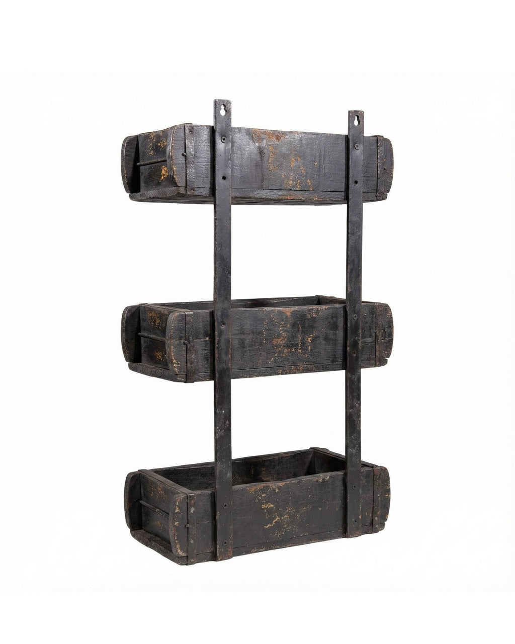 Originale gamle mursteinsformer, som er satt sammen med metallbånd. Vipps så har du en flott gammel trehylle laget av gamle mursteinsformer. Den er både praktisk og dekorativ, og passer like fint ute som inne.