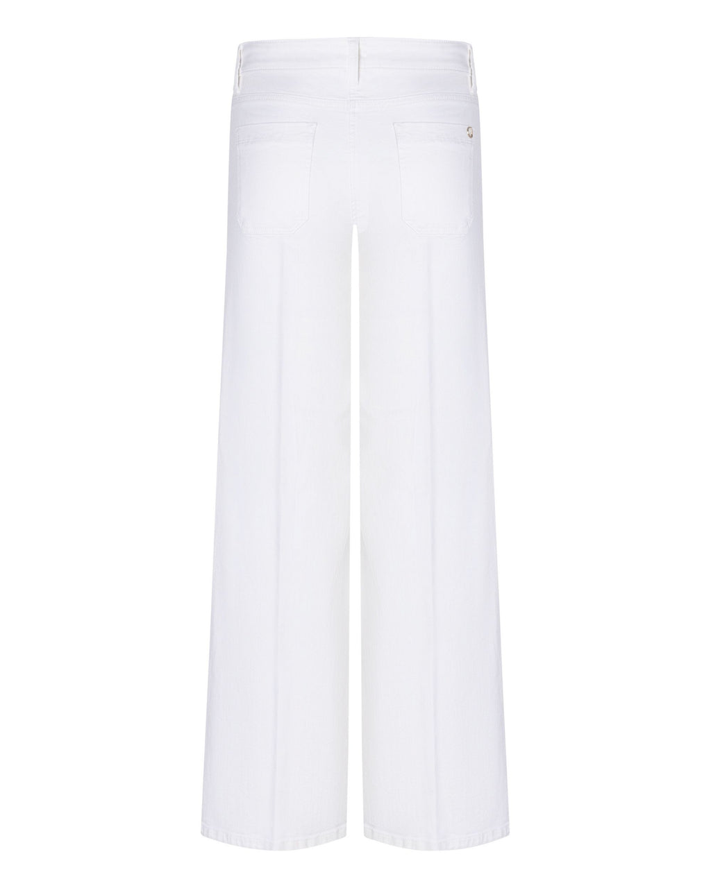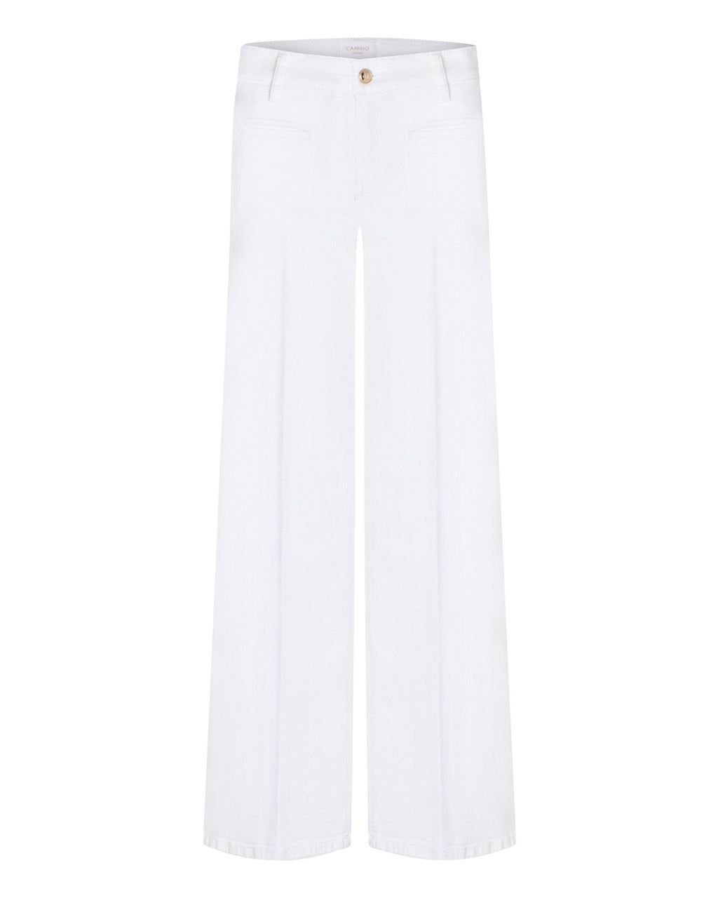 Tess er en klassisk og tidløs jeans fra Cambio. Noe strech med vide ben i full benlengde. Beltehemper og en gullknapp i livet. Små firkantede passepoilerte lommer foran og 2 gullnagler på hver baklomme og et gullemblem på høyre baklomme.