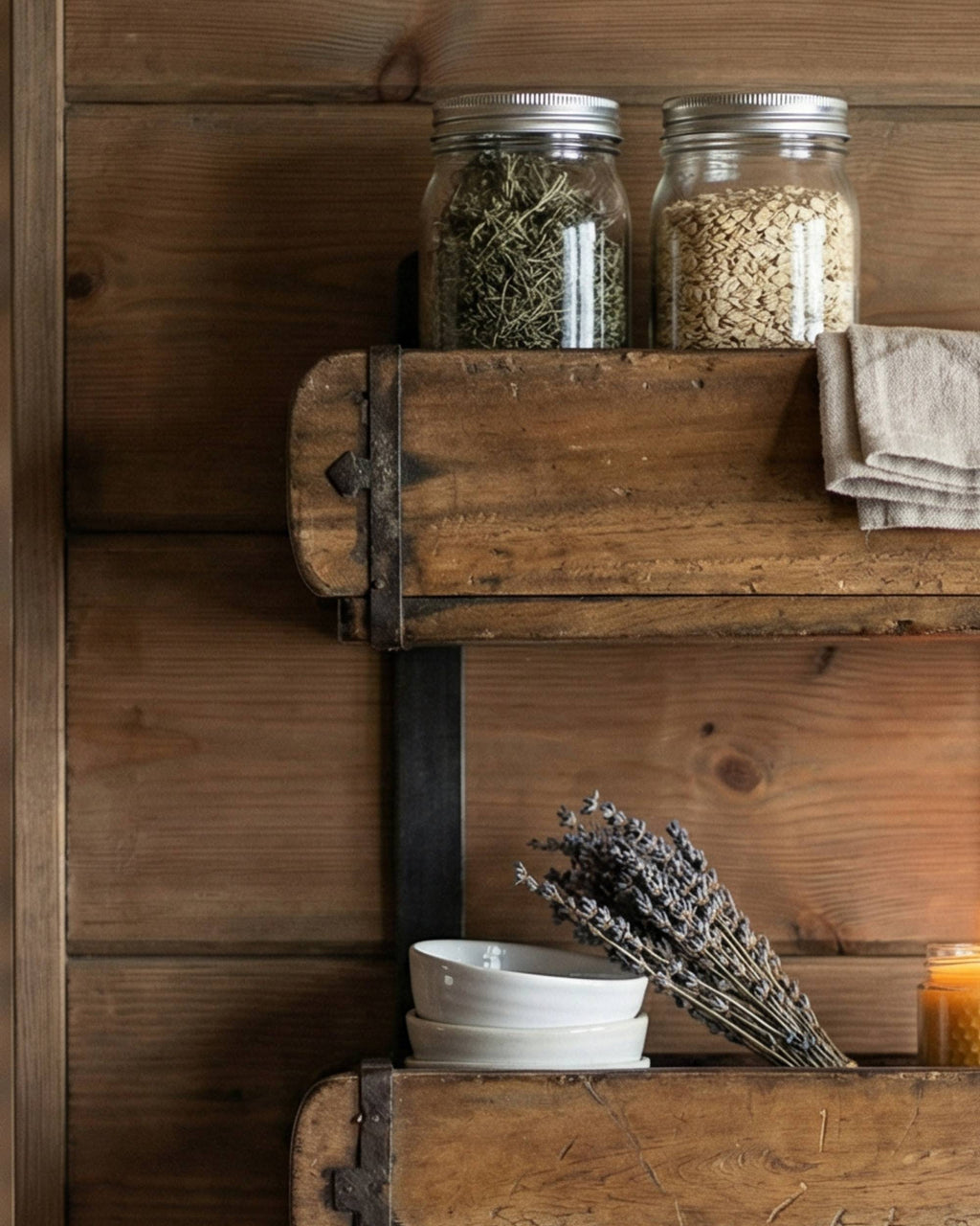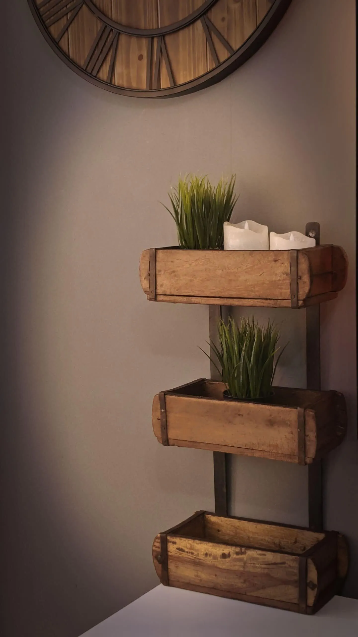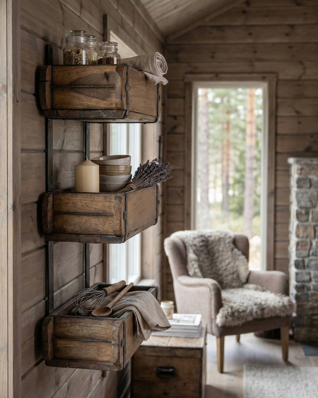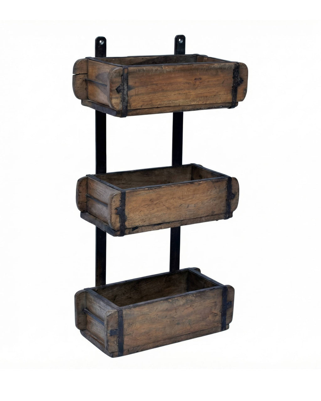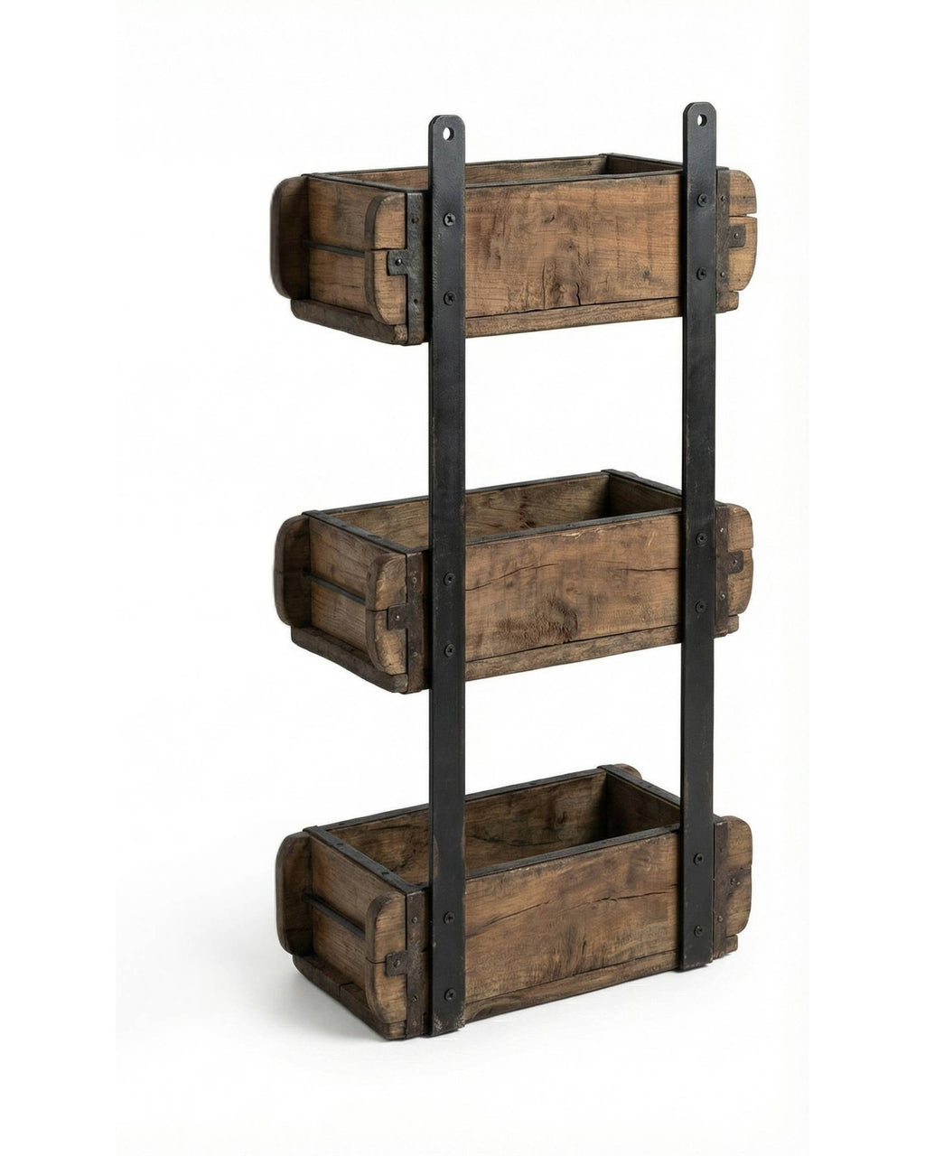 Denne hyllen fra Sjælsø består av tre originale, gamle mursteinsformer som er satt sammen med metallbånd bak. Dette gir denne utrolig kule trehyllen. Den er både praktisk og dekorativ, og passer like fint ute som inne.